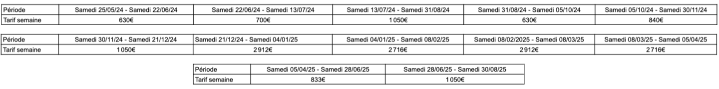 Le chalet des Cimes propose des réservations uniquement du Samedi au Samedi. Pour toute demande de réservation, merci de remplir le formulaire de contact présent sous la grille des tarifs, ou de nous contacter par téléphone.